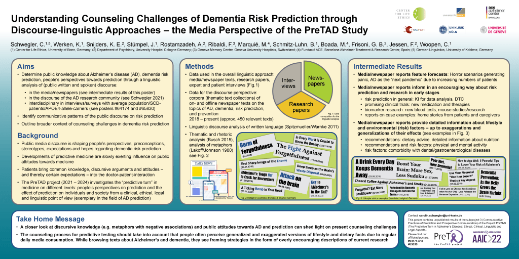 Schwegler, Carolin; Werken, Katrin; … Boada, Mercè; Frisoni, Giovanni; Jessen, Frank; Woopen, Christiane (2023): Understanding Counseling Challenges of Dementia Risk Prediction through Discourse-linguistic Approaches – the Media Perspective of the PreTAD Study. In: Alzheimer’s & Dementia 19 (5), e062917. https://doi.org/10.1002/alz.063917. (additional video).